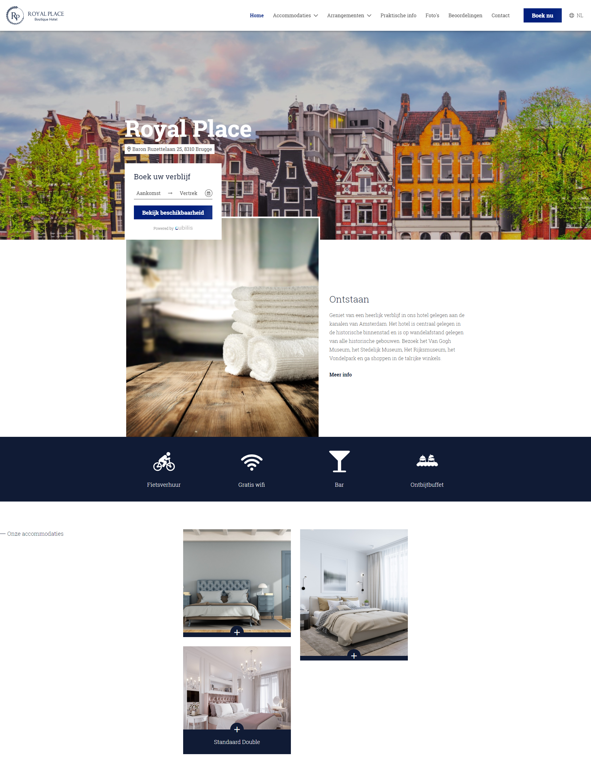 Show the booking system with references to different rooms and packages on every page of your website. Use large photos across the width of the homepage to give your clients a first impression of all the facilities of your accommodation.